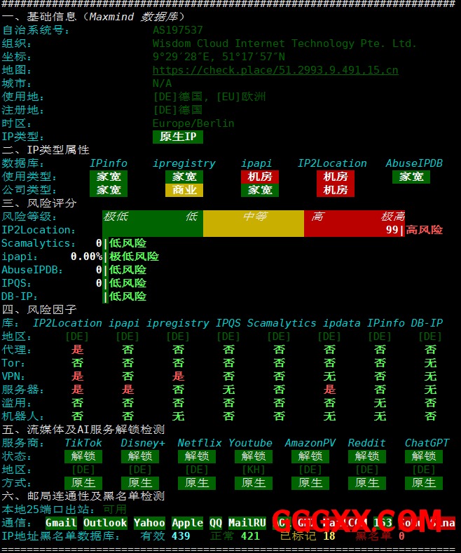 IP为德国原生双ISP属性IP,解锁能力不错,不过具体的解锁请自行参考上面的测评数据~~
