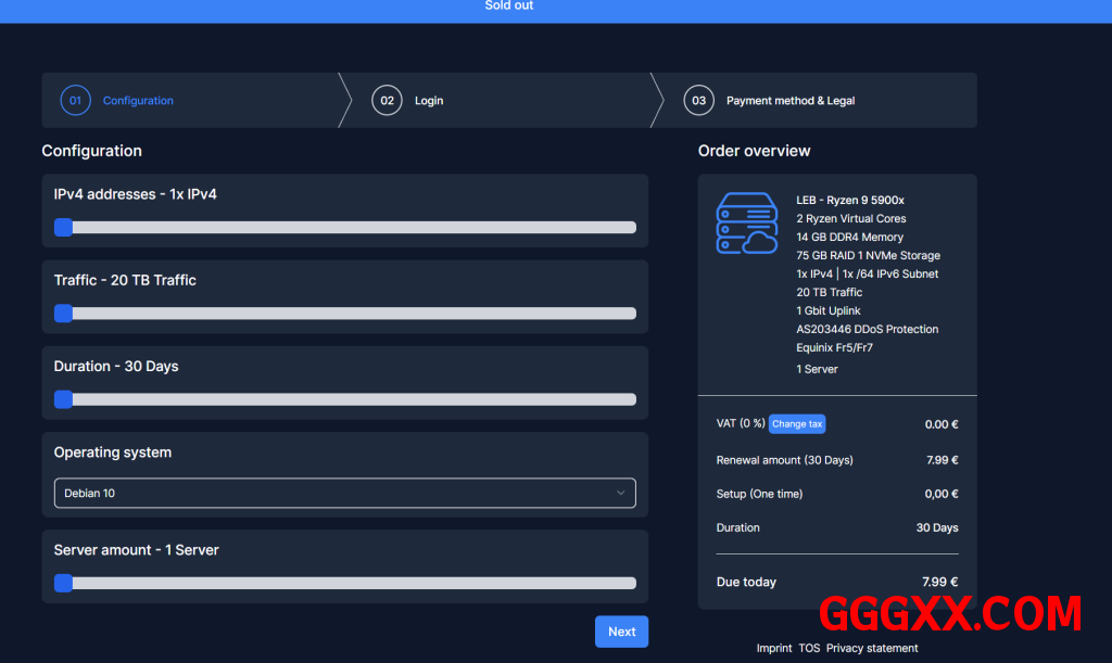 流量:20 TB / 月(1Gbps端口,双向计算)