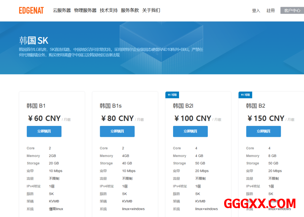 SK线路,韩国本土ip,不限制流量,从2G内存开始支持windows系统。