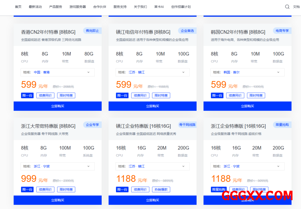 | 8核 | 8GB | 100G | 100Mbps | 浙江 | 999元/年 | 链接 |