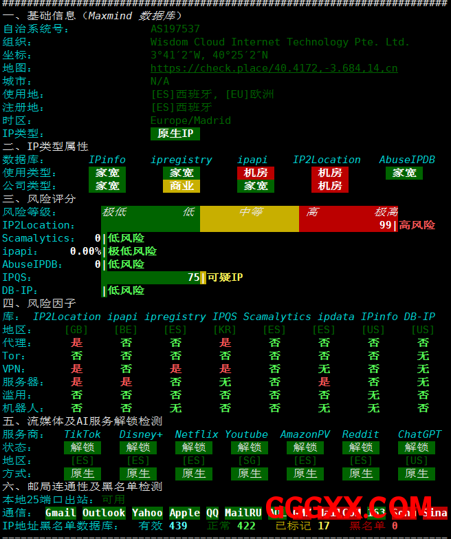 IP为西班牙原生IP,具有双ISP属性,具体的可以参考上面的测评数据~