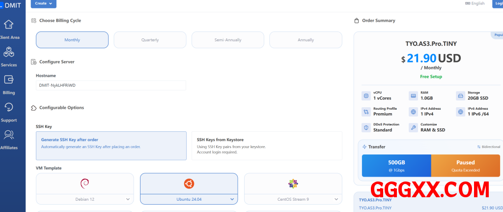 特征:基于kvm虚拟,1Gbps带宽,自带 1IPv4 & 1 IPv6 /64,线路 CN2 GIA/10099(9929)/CMI。流量超出会暂停。