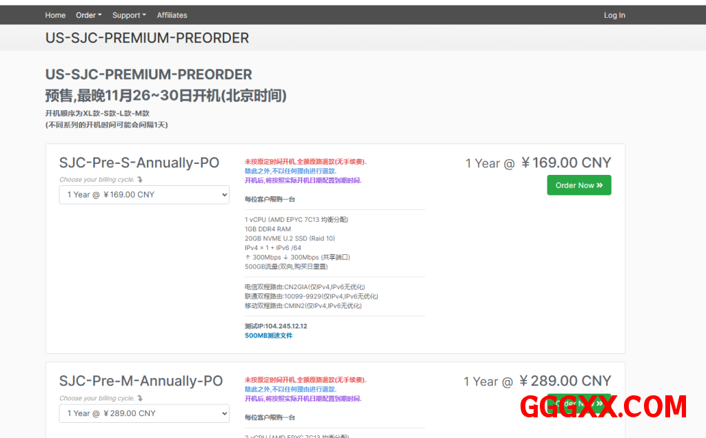 预售机型,最晚11月26~30日开机(北京时间),未按原定时间开机,全额原路退款(无手续费)。除此之外,不以任何理由进行退款。开机后,将按照实际开机日期配置到期时间。关于预购价格,已经在成本和现有配置之间做了最大程度的均衡,除最大带宽方面有所减配其他维持不变,价格(每年)略微上浮了10~20块钱。