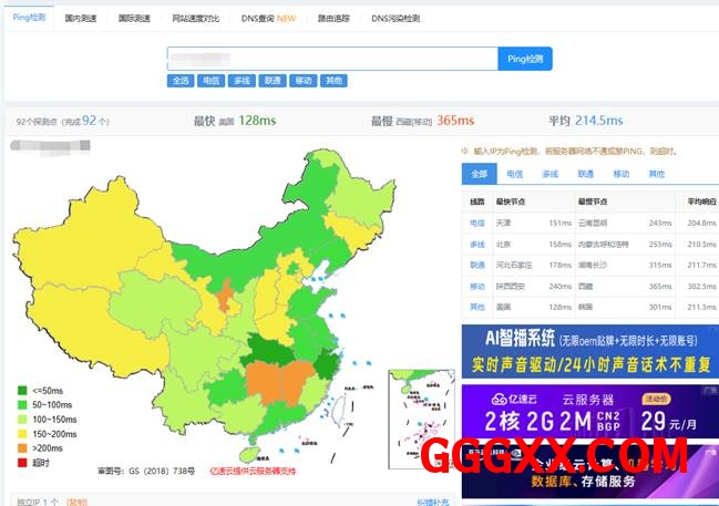各地区延迟情况 平均延迟214.5
